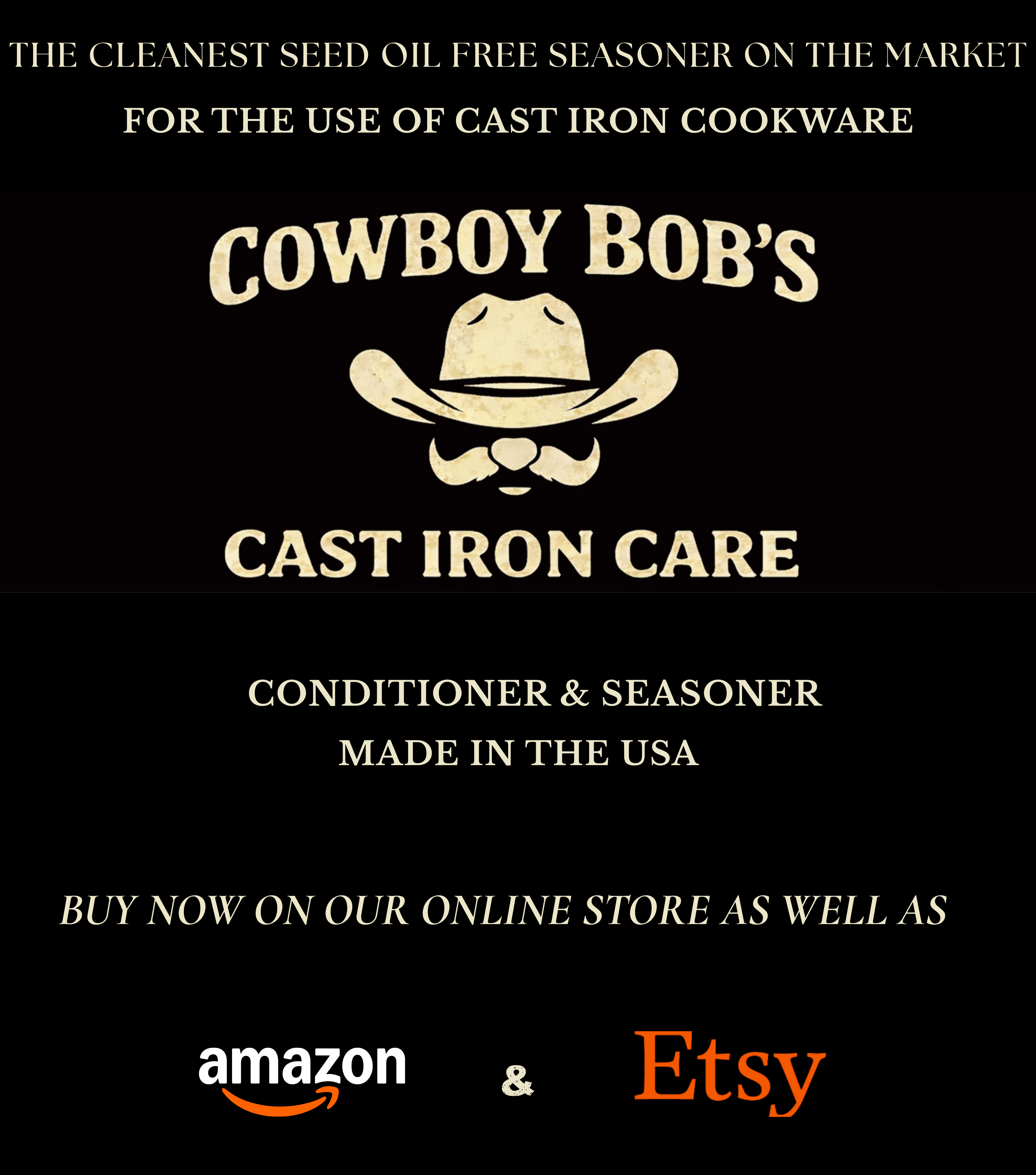 - Wipe clean, dry thoroughly, warm pan, then reapply Cowboy Bob's Cast Iron Care.
